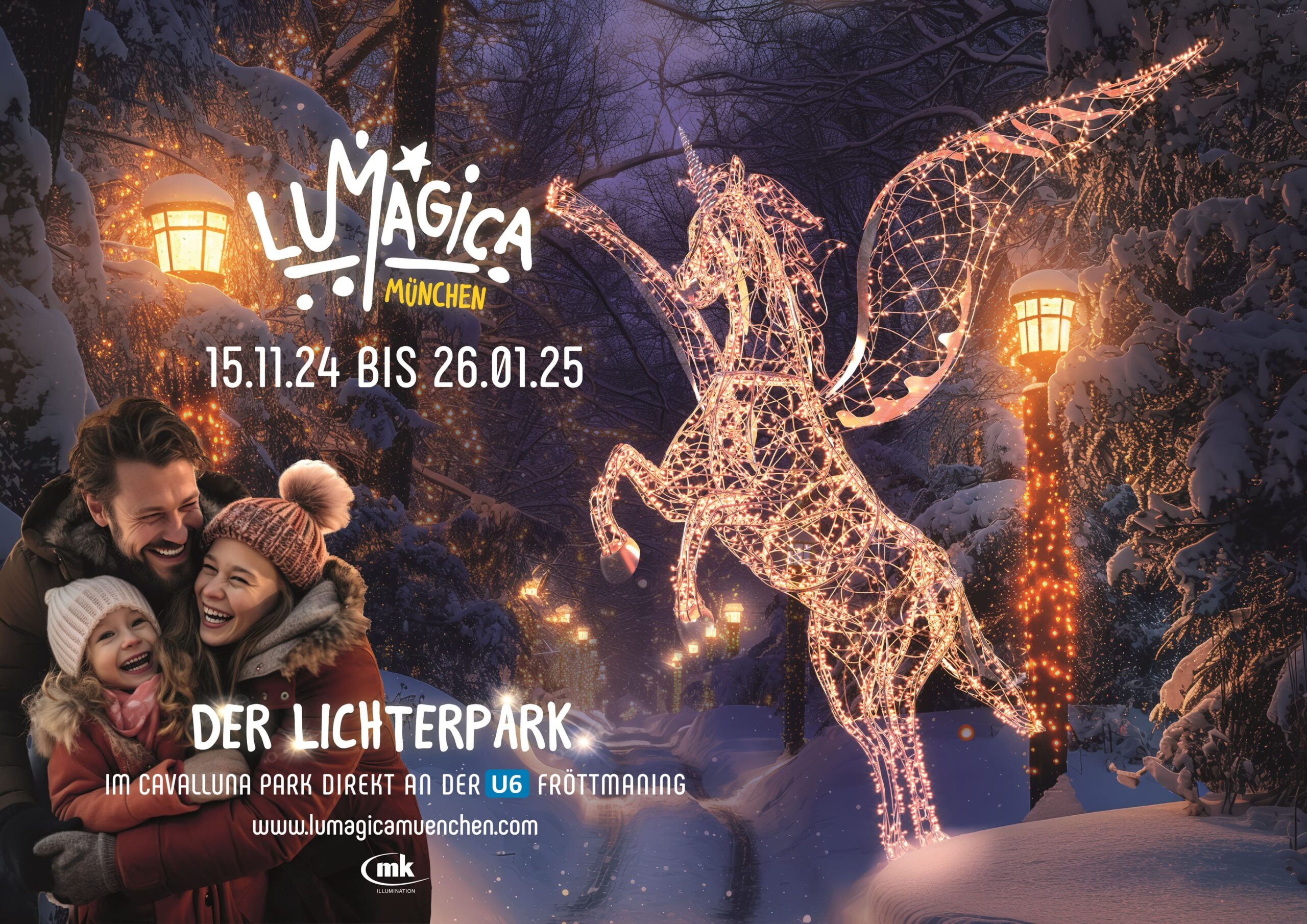 Nach dem erfolgreichen Debüt in 2023 kehrt LUMAGICA nach München zurück. Die märchenhaften Lichterparks von LUMAGICA, die bereits an 34 Standorten weltweit begeisterten, laden nun wieder auf dem Gelände des CAVALLUNA Parks in Fröttmaning vom 15. November 2024 bis zum 26. Januar 2025 zu einem zauberhaften Spaziergang durch eine funkelnde Lichterwelt ein. Auf einem 1,5 km langen Rundweg können große und kleine Besucher 750.000 funkelnde LEDs in über 300 handgefertigten, leuchtenden Objekten und Installationen bewundern, begleitet von stimmungsvoller Musik. Die erfahrenen Lichtkünstler von LUMAGICA haben die Besonderheiten des CAVALLUNA Parks in München auch in diesem Jahr geschickt in Szene gesetzt und eine magische Atmosphäre geschaffen, die in der dunklen Jahreszeit zum Träumen einlädt. Der winterliche Rundgang durch die kunstvoll beleuchteten Landschaften ist ein Highlight für die ganze Familie.